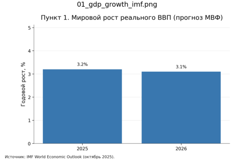 IMF (WEO Oct’2025): мировой рост 3,2% в 2025 и 3,1% в 2026, ниже допандемийной “нормы” (IMF отдельно отмечает замедление и “диммер”-ландшафт). IMF
