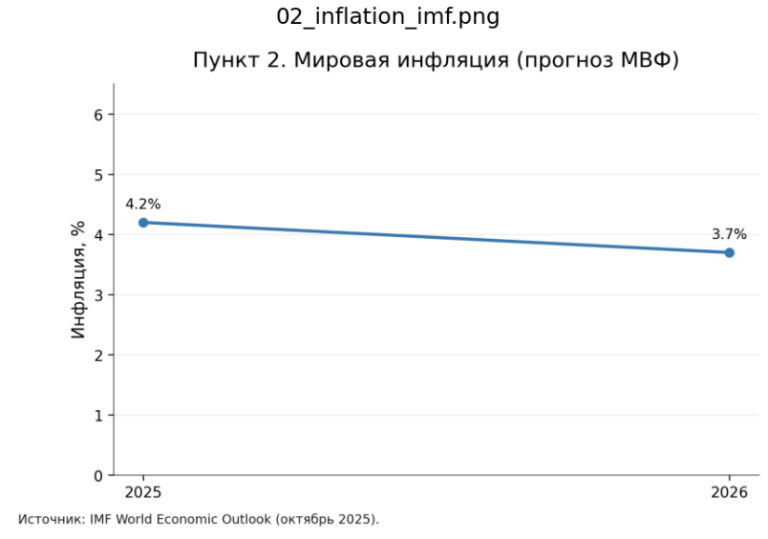 IMF (WEO Oct’2025): мировая инфляция (headline) прогнозируется 4,2% в 2025 и 3,7% в 2026 (то есть дезинфляция продолжается, но не мгновенно). IMF