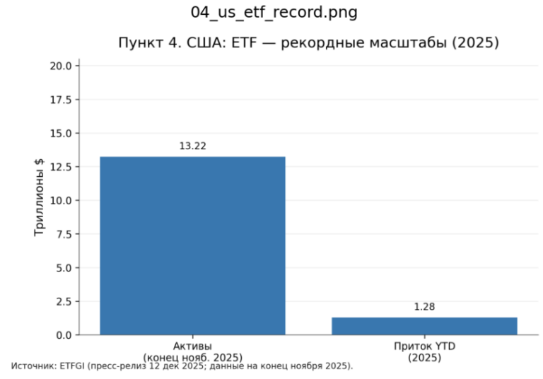 США: YTD net inflows в ETF — $1,28 трлн (рекорд), активы индустрии $13,22 трлн на конец ноября, по ETFGI. ETFGI LLP