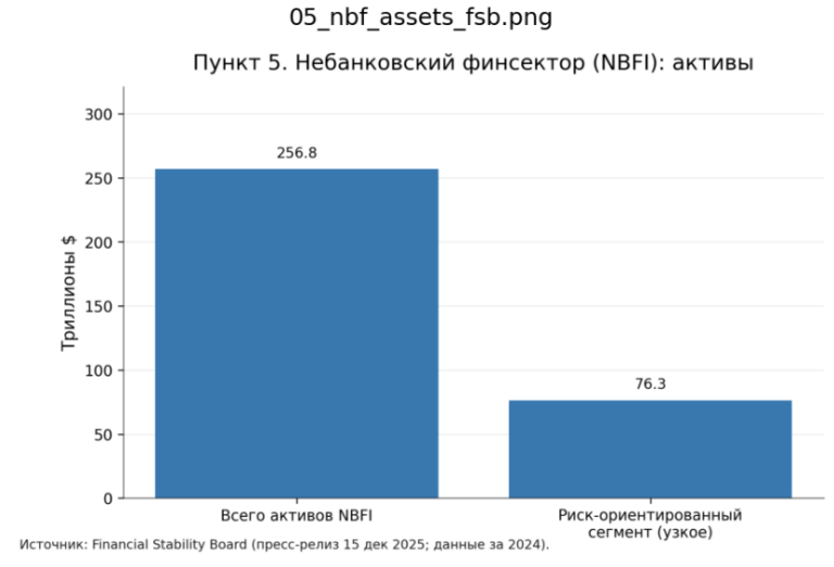 По данным Financial Stability Board (FSB), небанковские финансовые институты выросли до $256,8 трлн и держат 51% глобальных финансовых активов; сегмент “с повышенными рисками” — $76,3 трлн. Reuters+1