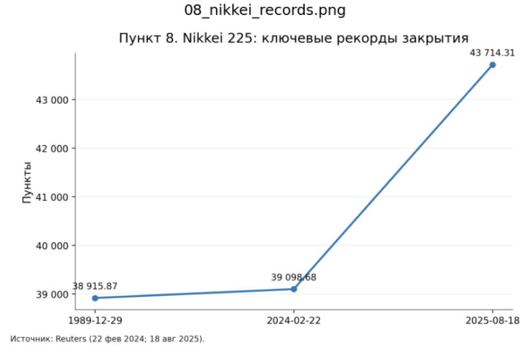 Япония: Nikkei в 2025 обновлял исторические максимумы на тех-ралли. Reuters