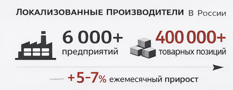По данным Минпромторга: в реестре российской продукции — более 400 тыс. товарных позиций от почти 6 тыс. производителей, а прирост — 5–7% в месяц. Telegram+1