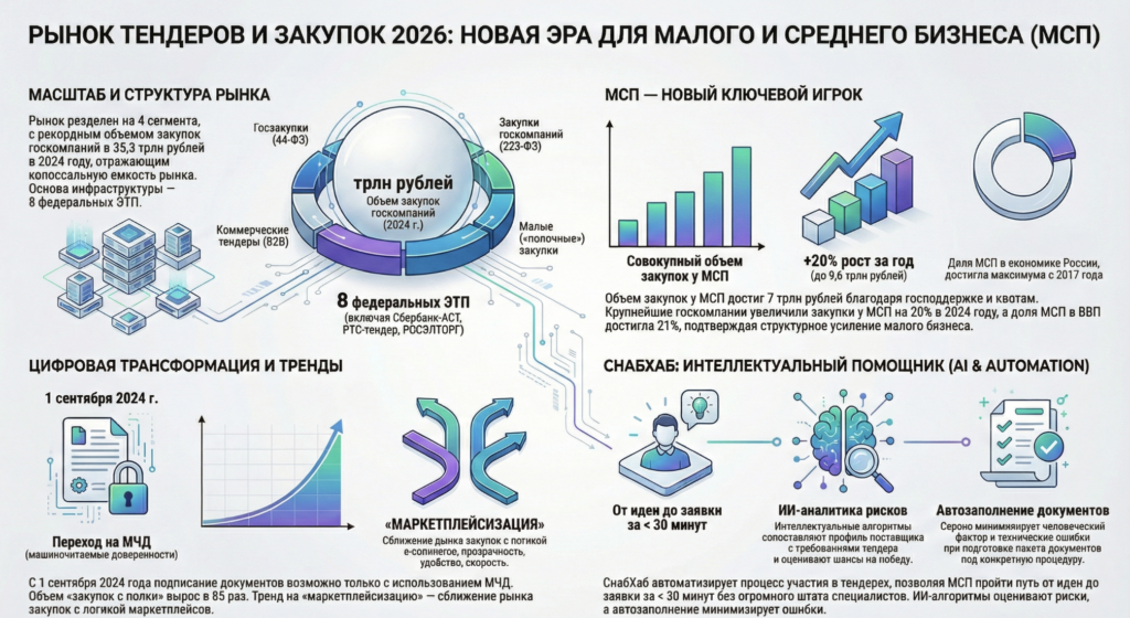 Под воздействием законодательства (94‑ФЗ, затем 44‑ФЗ и 223‑ФЗ), кризисов, санкционного давления и технологического прогресса рынок закупок превратился в крупный сегмент цифровой экономики. Только объем закупок госкомпаний в 2024 году достиг рекордных 35,3 трлн рублей. Значительная часть этих средств распределяется через ЭТП, формируя огромный рынок для поставщиков, операторов платформ и сервисных компаний.