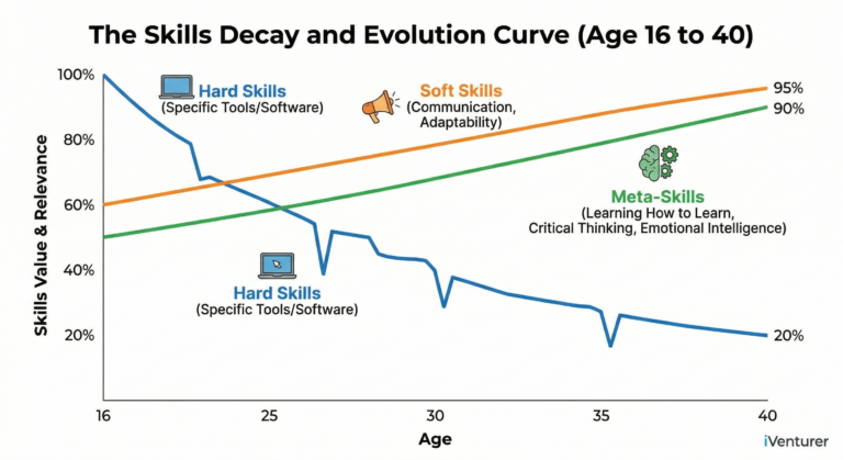 Логика: Главная проблема традиционного образования в том, что оно учит «знаниям, которые static» в мире, где знания становятся «dynamic». Этот график показывает, что hard skills (жесткие навыки) устаревают за 3–5 лет, в то чем soft skills (мягкие навыки) и мета-навыки (например, критическое мышление или умение учиться) сохраняют свою ценность всю жизнь. В 16 лет критически важно сфокусироваться именно на них.